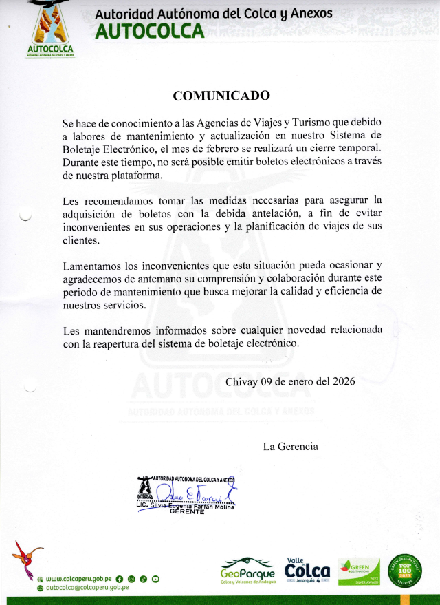 La gerente de AUTOCOLCA, Lic. Solange Málaga Cáceres, exhortó a las agencias de viaje, que ofrecen servicios de visita al Valle del Colca a ponerse a derecho. Asimismo, recomendó a los turistas nacionales y extranjeros a contratar movilidades con los permisos y licencias correspondientes, y emplear guías acreditados y oficiales que cumplan con todos los requisitos legales. Este llamado busca asegurar una experiencia turística segura para los visitantes.